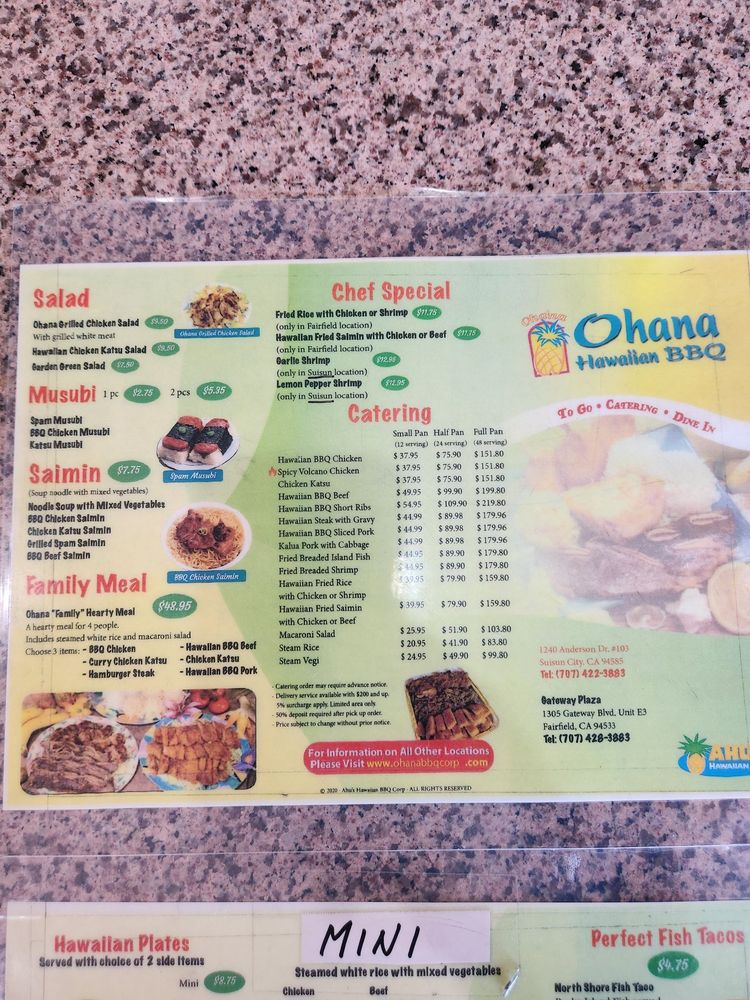 Ohana Hawaiian BBQ, located in Fairfield, CA, offers a casual dining experience that is perfect for lunch or dinner. With a variety of Hawaiian BBQ dishes on the menu, this restaurant is great for groups, families, and even has options for vegetarians. The menu includes traditional Hawaiian favorites like teriyaki chicken, kalua pork, and spam musubi. The restaurant also offers waiter service, catering, and has the option for both Android and Apple Pay for convenience. Additionally, they have a full bar with alcohol options and provide a welcoming atmosphere for dogs. Whether you're looking to dine in or take out, Ohana Hawaiian BBQ is a must-visit spot for delicious Hawaiian cuisine in the Fairfield area.